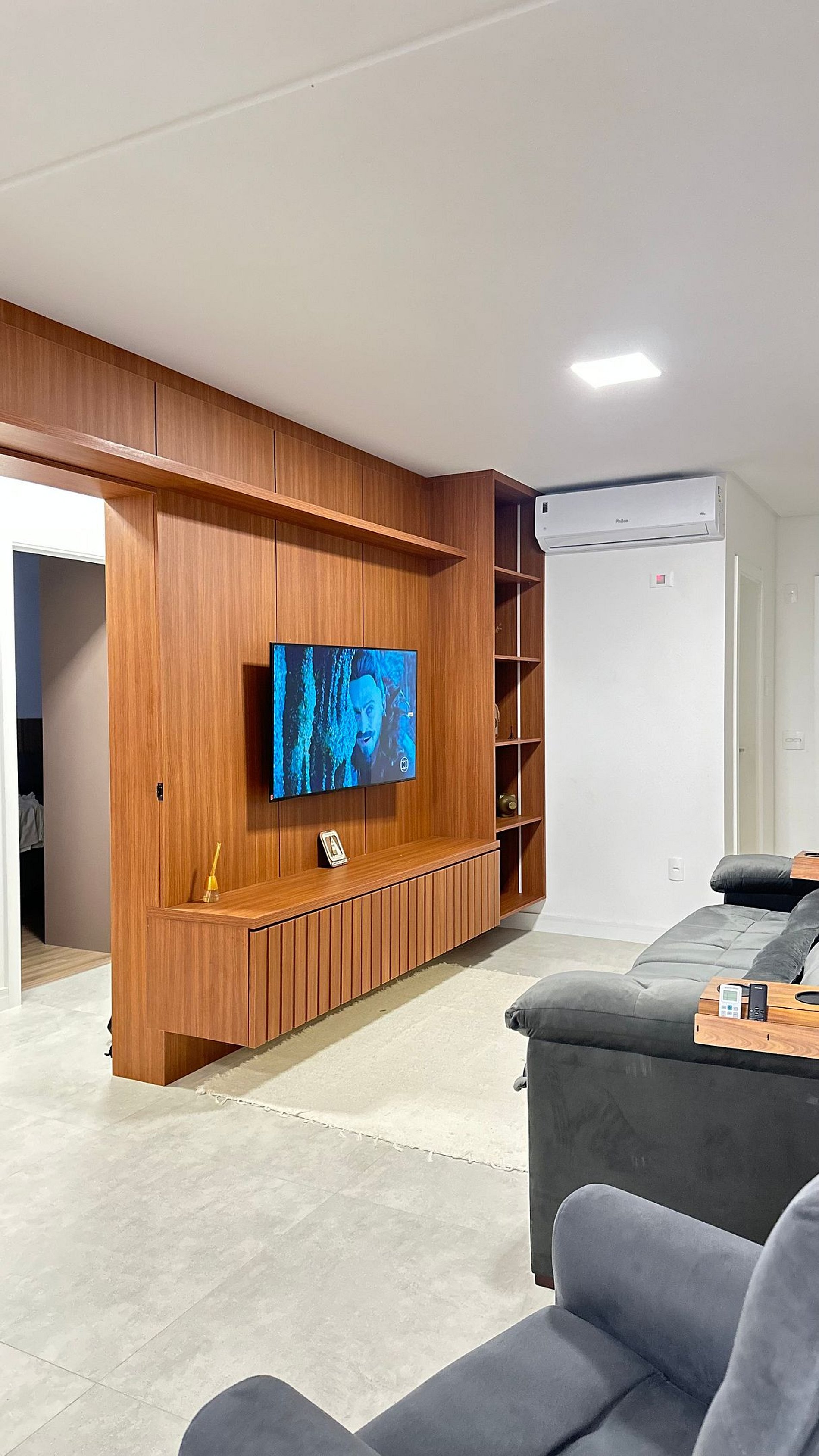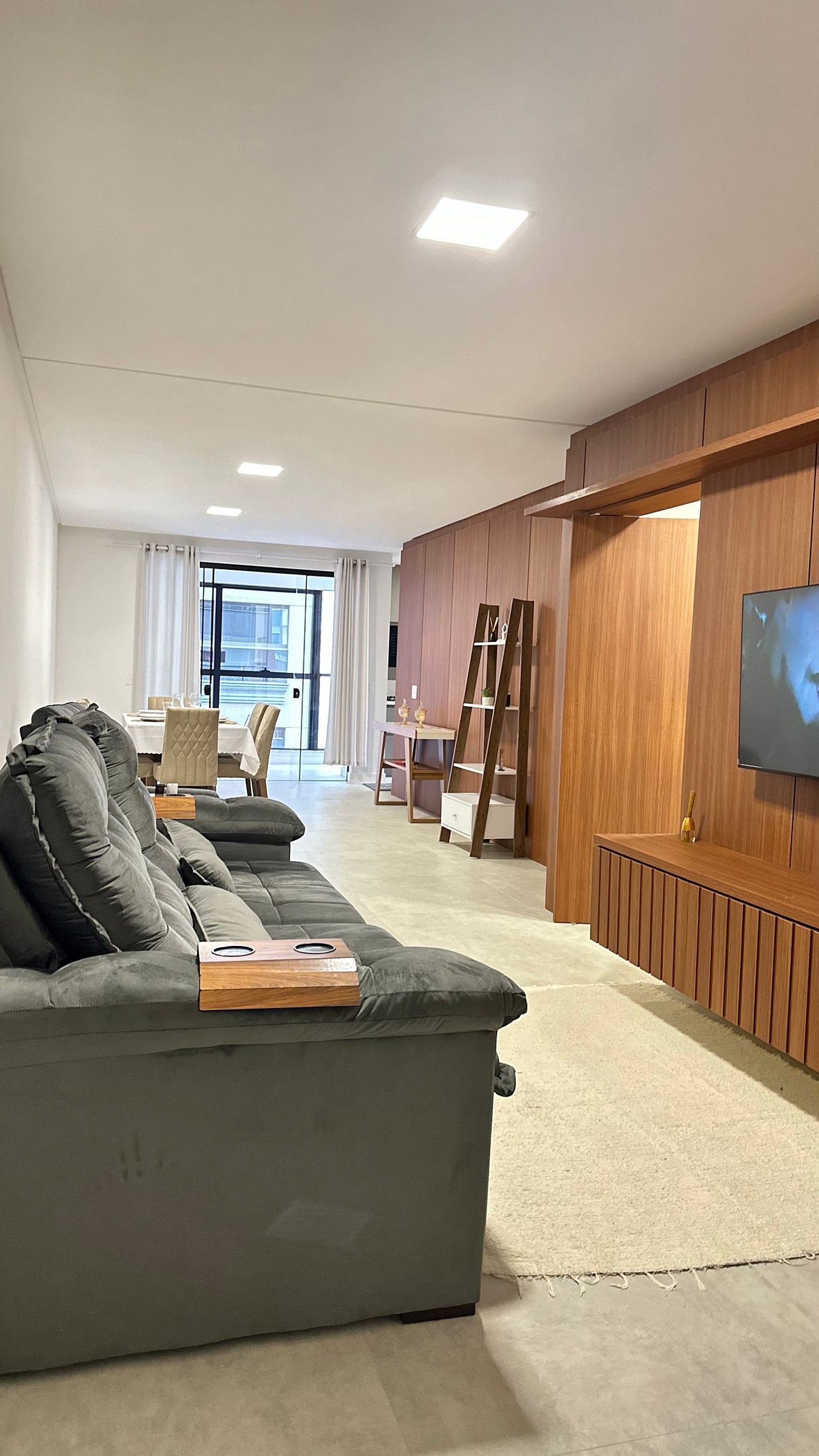 Sala de estar espaçosa com ar-condicionado e TV de 50”