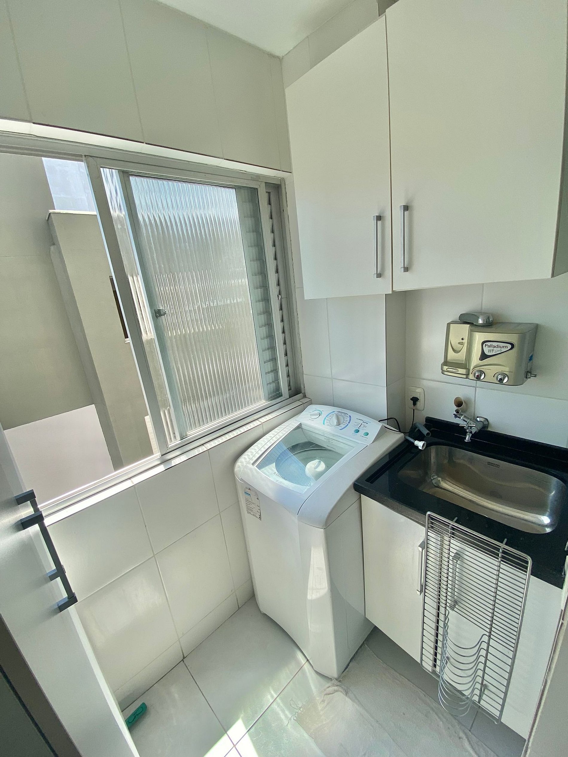 A cozinha vem completamente equipada, atendendo às necessidades de preparo de refeições, desde lanches rápidos até jantares mais elaborados. A área de serviço, com máquina de lavar, adiciona praticidade para estadias mais longas.