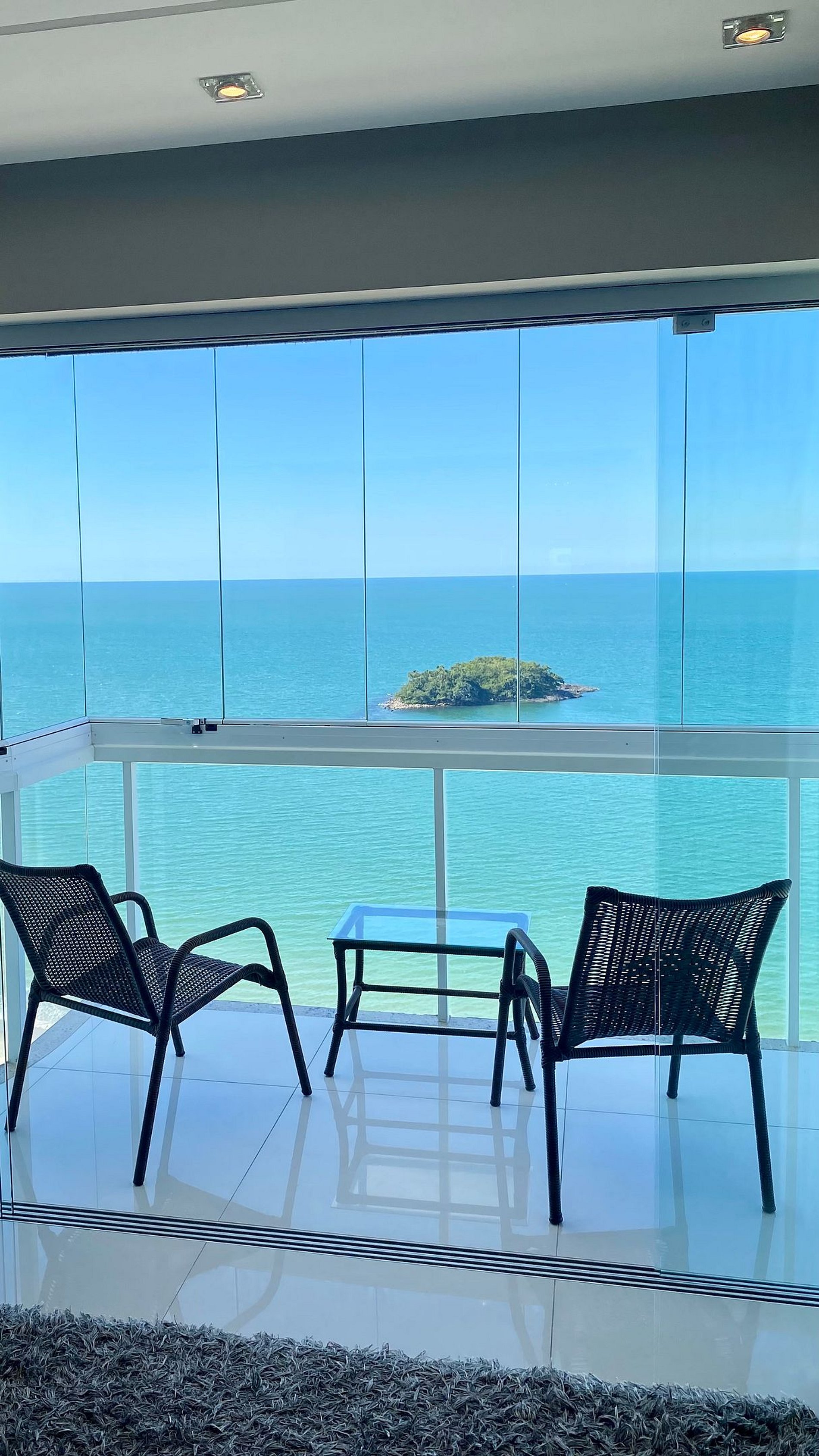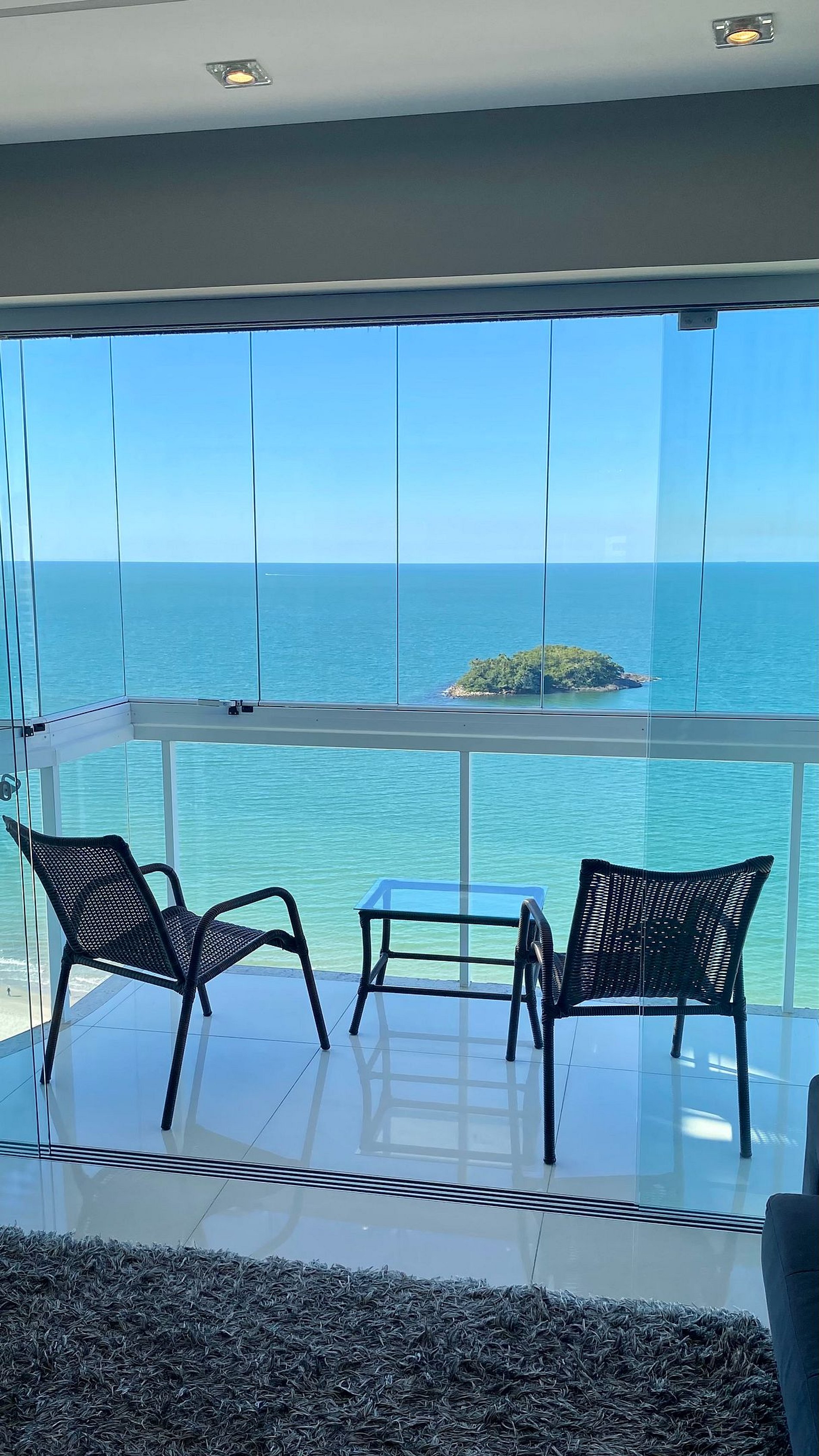 Ampla sacada frente mar — perfeita para relaxar admirando a Ilha das Cabras